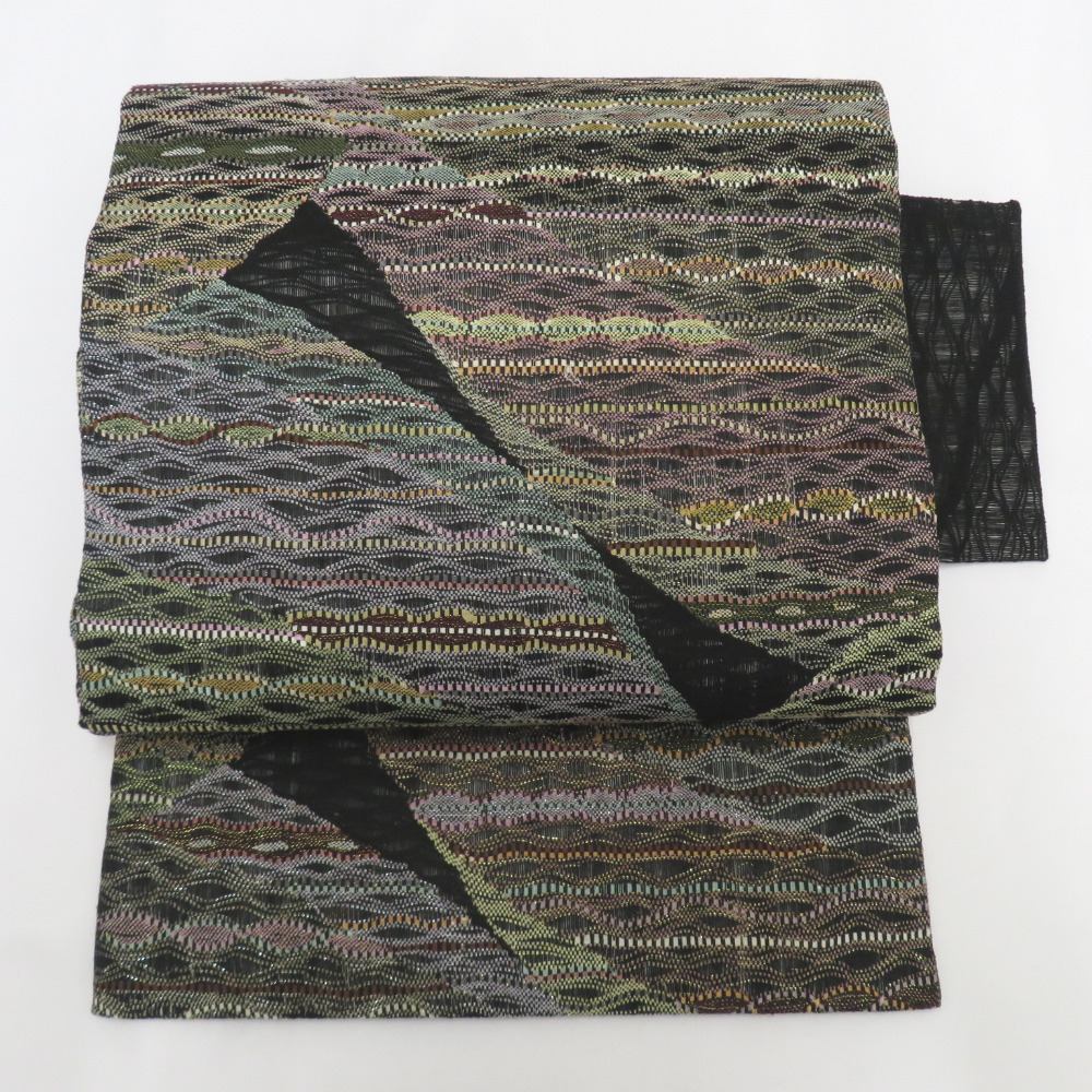 > 名古屋帯 織り柄 すくい織 黒色×多色 正絹 九寸なごや帯 六通柄 カジュアル 仕立て上がり 着物帯 長さ380cm