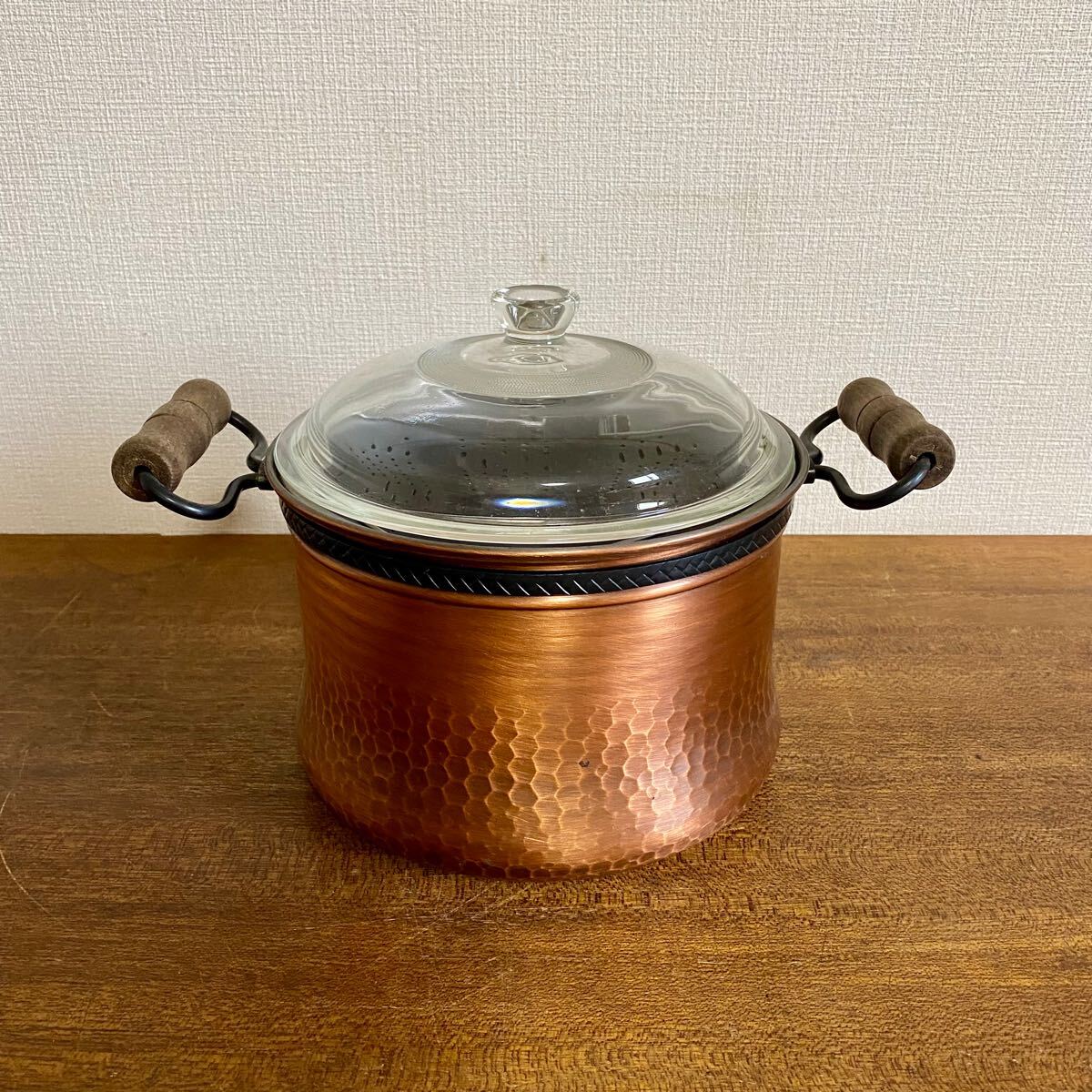 - 銅製 両手鍋 ガラス蓋 蒸しカゴ付き / 深型鍋 調理器具 銅鍋 レトロ