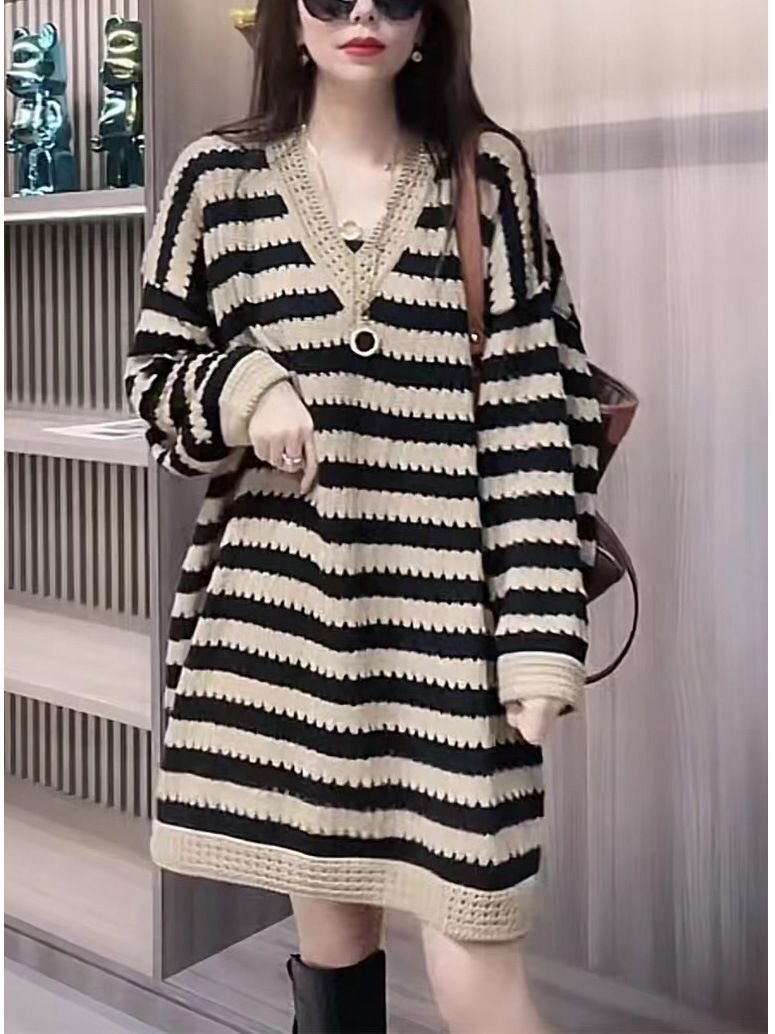 - OHJ784★ボーダーワンピース レディース ニット Vネック オーバーサイズ ボーダー柄ワンピース体型カバーニットワンピース 春秋 セーター