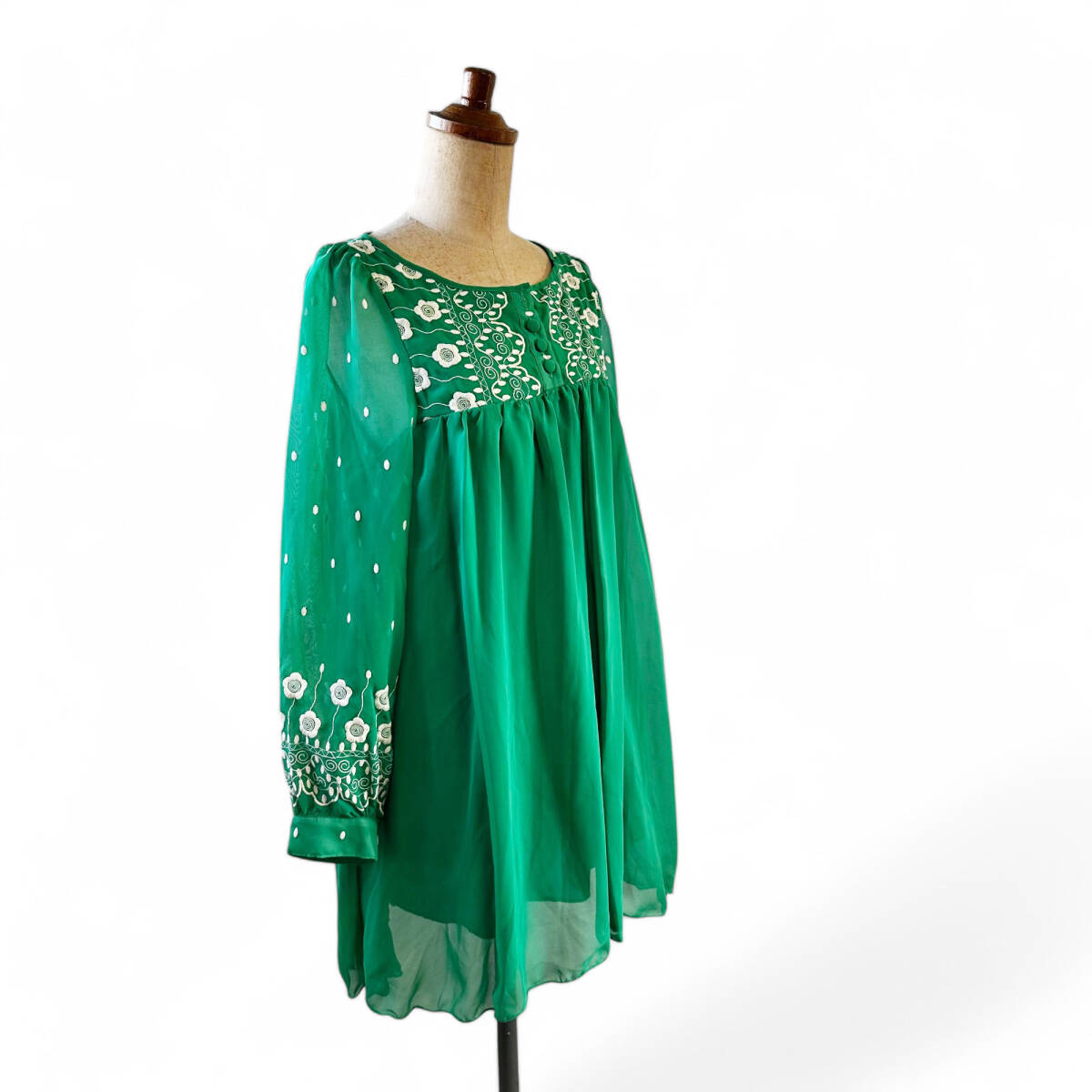 - N2281a SpRay スプレイ シフォン 長袖 チュニック Mサイズ 緑/グリーン ワンピース レトロデザイン 刺繍