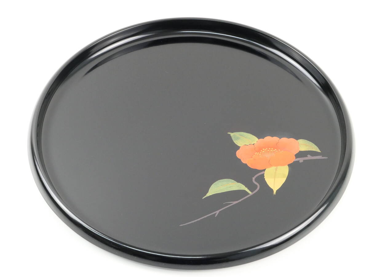 - 値下げ中!未使用美品!会津塗り 木乾漆 丸盆 紅山茶花 直径さ約30cm / 工芸品 茶道具 漆器【F954S36】