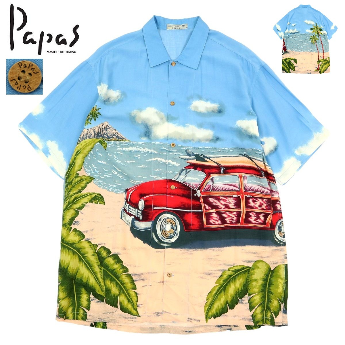 - 【Y127】【レーヨン100%】Papas パパス アロハシャツ 半袖シャツ 車 雲 ヤシの木 レッド