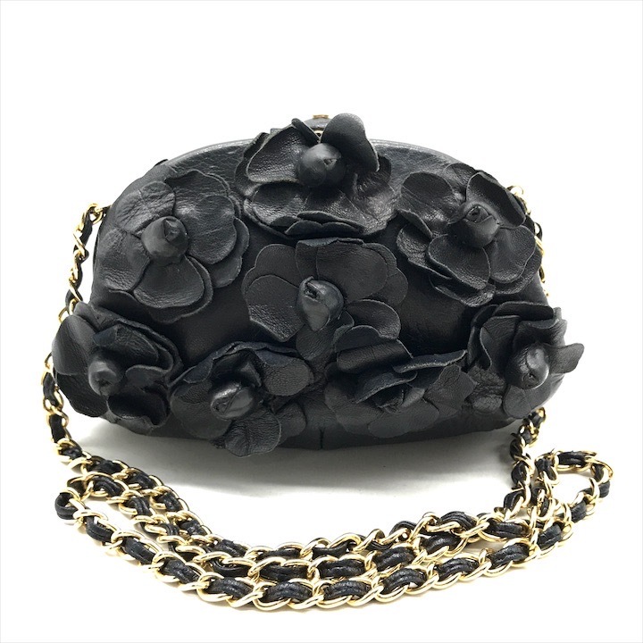 - 良品 CHANEL シャネル ラムスキン 3D カメリア チェーン がま口 ショルダー バッグ ブラック a4423