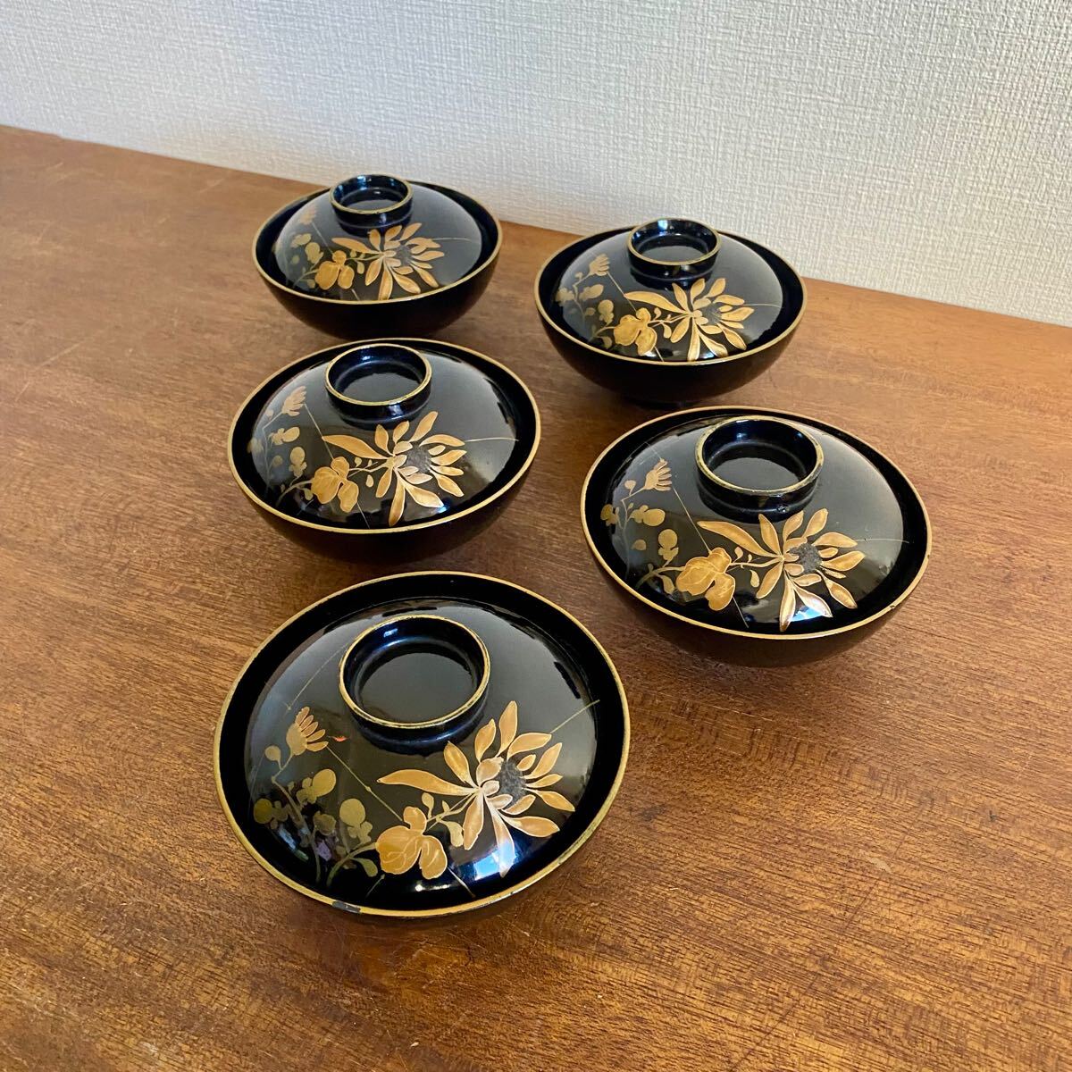 - 漆器 蓋付き 汁椀 吸物椀 5客セット / 漆塗り 工芸品 木製 金彩 当時物