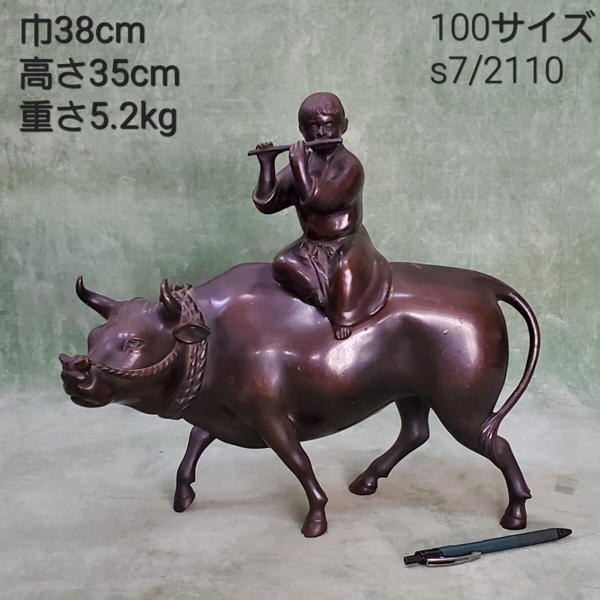 - 銅製 牛 のったり 笛吹童子 (検索 置物 唐銅 骨董 古美術 アンティーク コレクター コレクション 時代物 s7/2110