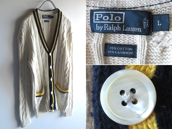 > 希少 00sビンテージ Polo by Ralph Lauren ラルフローレン カラーライン コットンカシミヤ ケーブルニット カーディガン L エクリュ 紺 黄