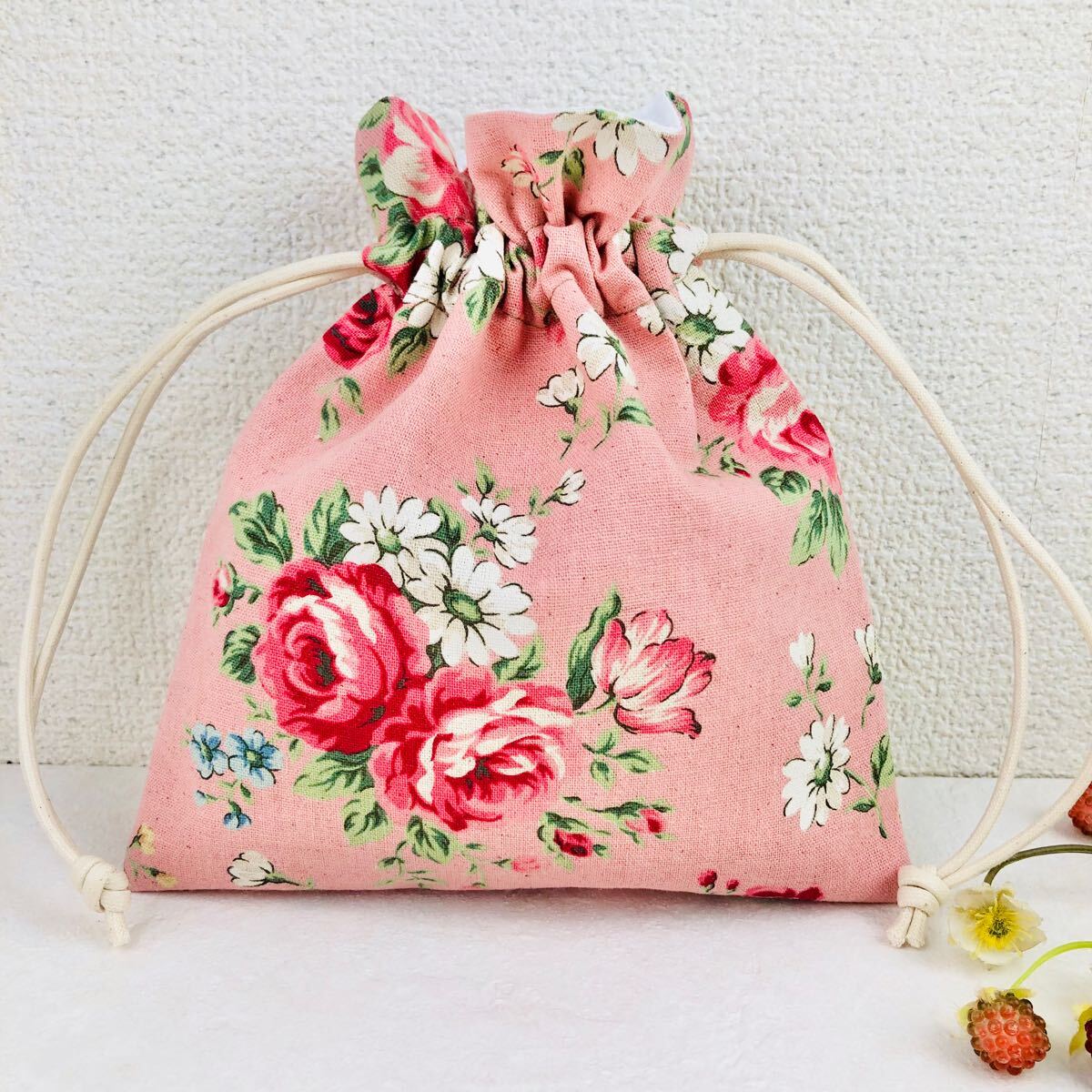- アンティークローズのフリル巾着袋 ハンドメイド 巾着 コップ袋 薔薇 ローズ柄 ピンク