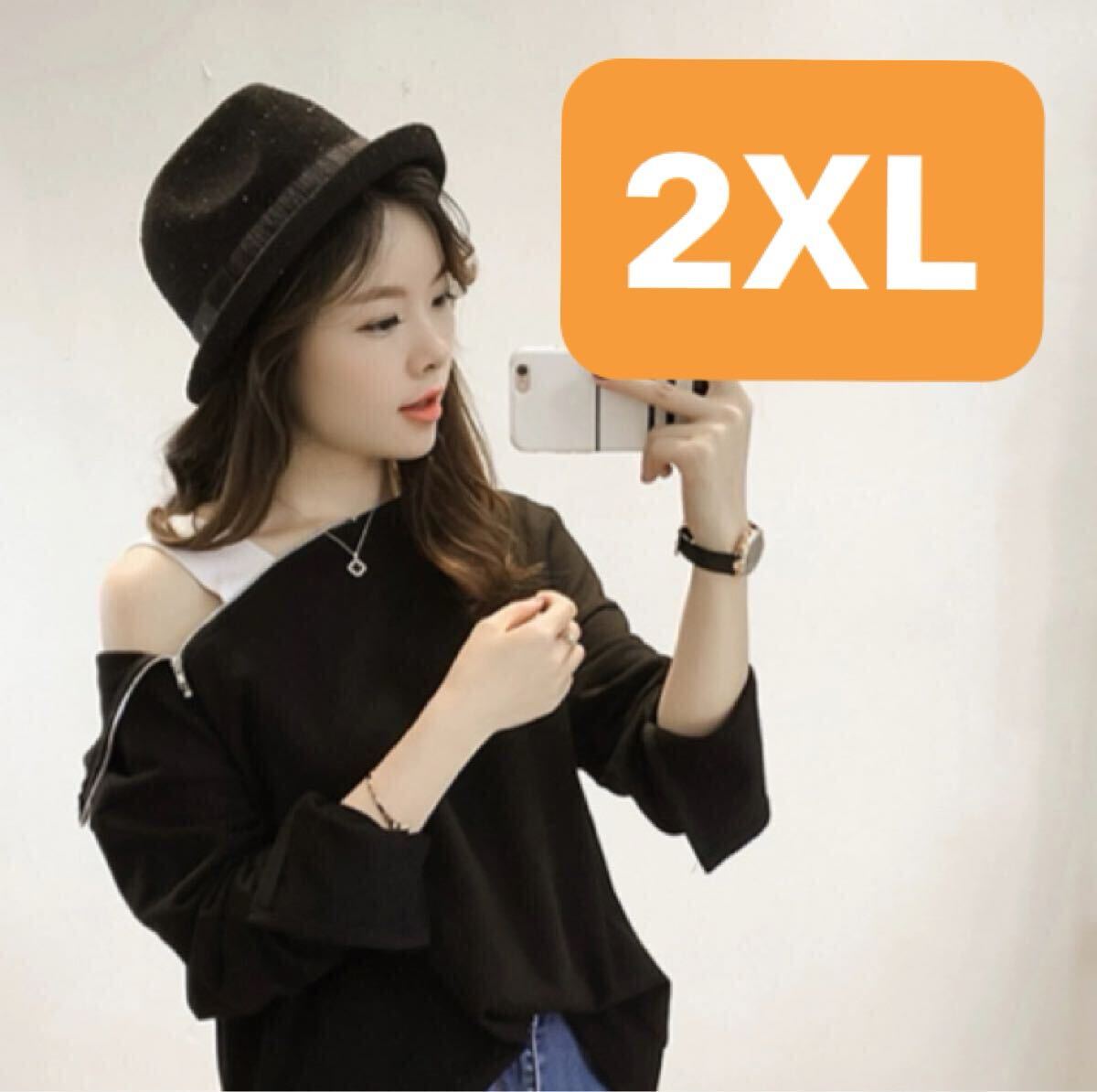 > オフショルダー パーカー 2way ジップ 長袖 トップス フード プルオーバー トレンド ストリート オルチャン 絶賛 セクシー セレブ 黒 2XL