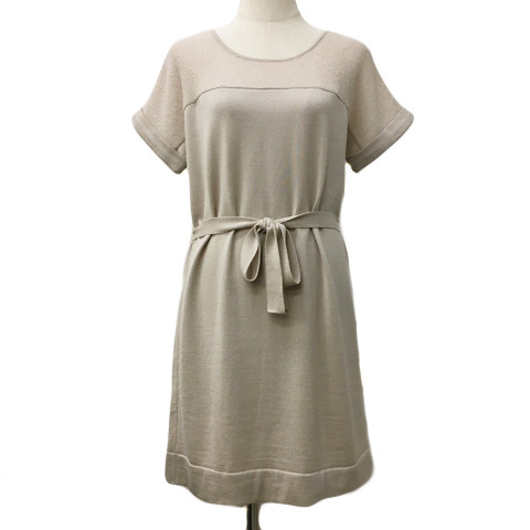 > ナチュラルビューティー NATURAL BEAUTY ワンピース Iライン ミニ ニット ウール 切替 リボンベルト 無地 半袖 38 ベージュ レディース
