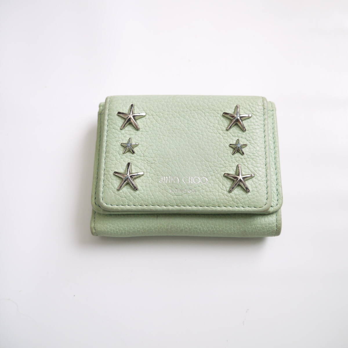 > $ 美品 $ 激レア◆ JIMMY CHOO ◆ ジミーチュウ ◆ NEMO UUF 星 スター モチーフ スタッズ付き レザー◆ 3つ折り 財布 ◆ ミントグリーン系