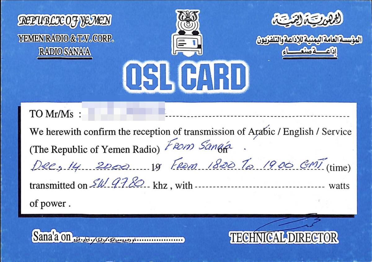 - 即決★送料込★BCL★入手困難★希少ベリカード★ラジオ・サナア★RADIO SANAA★イエメン民主共和国★2000年