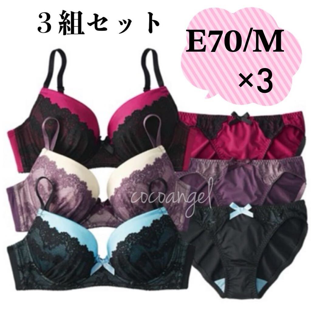- 【3セット!E70/M 上下セット】新品 ブラジャーショーツセット 計6枚 パッド付き ブラ&ショーツ 寄せ上げ 盛りブラ ランジェリー Eカップ