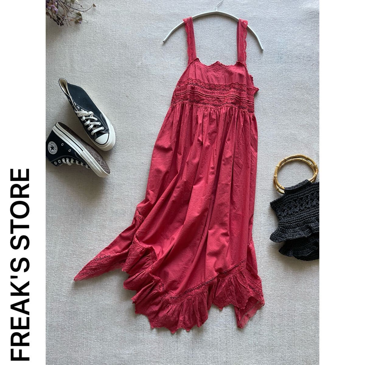 - フリークスストア レーステープキャミソールワンピース ノースリーブマキシワンピース ドレス 未使用フリーサイズ 赤 ヴィンテージ風