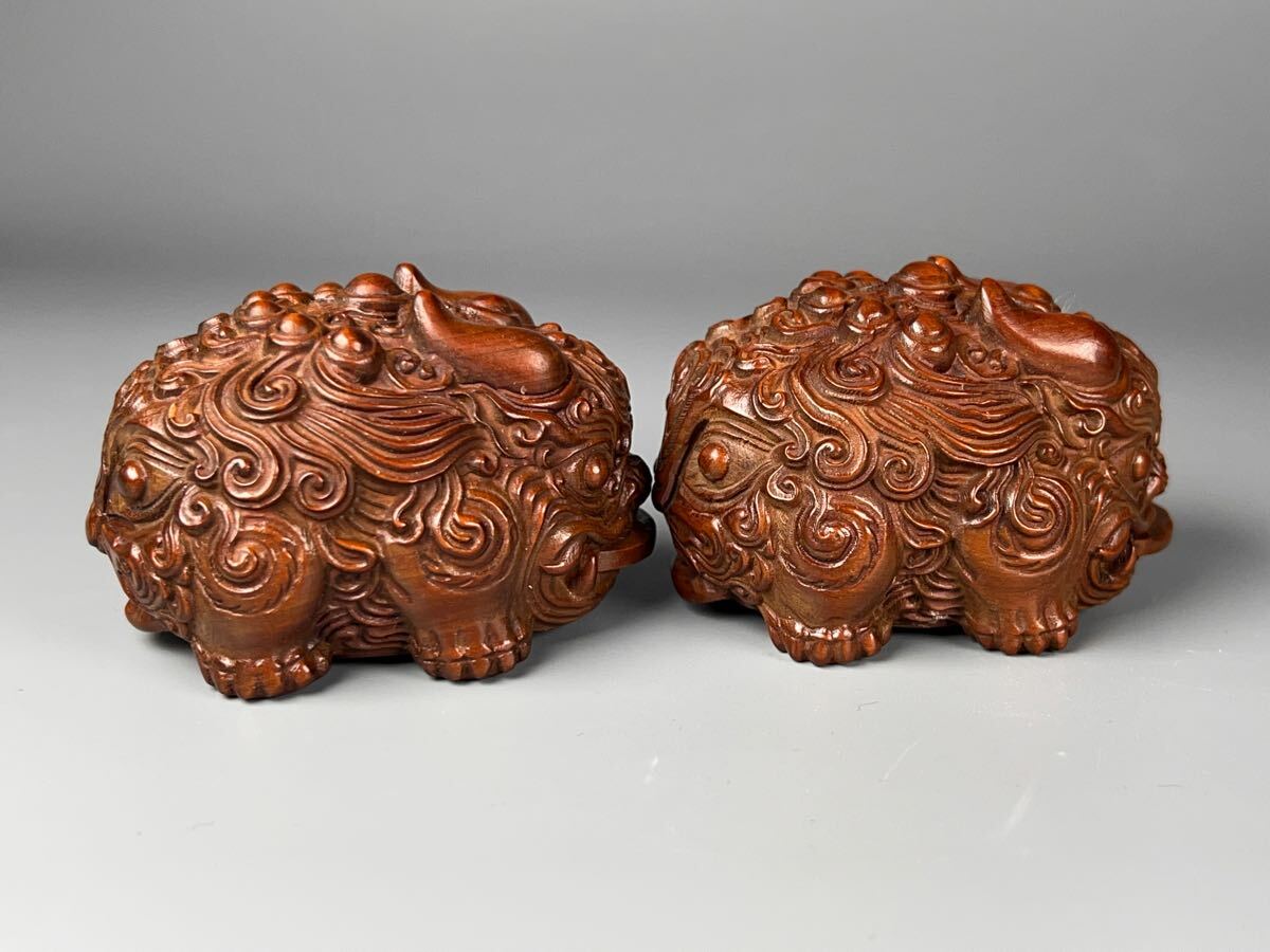 - 古美術 木製 黄楊木 貔貅 金運 財運 縁起物 一対 細工 一刀彫 置物 根付