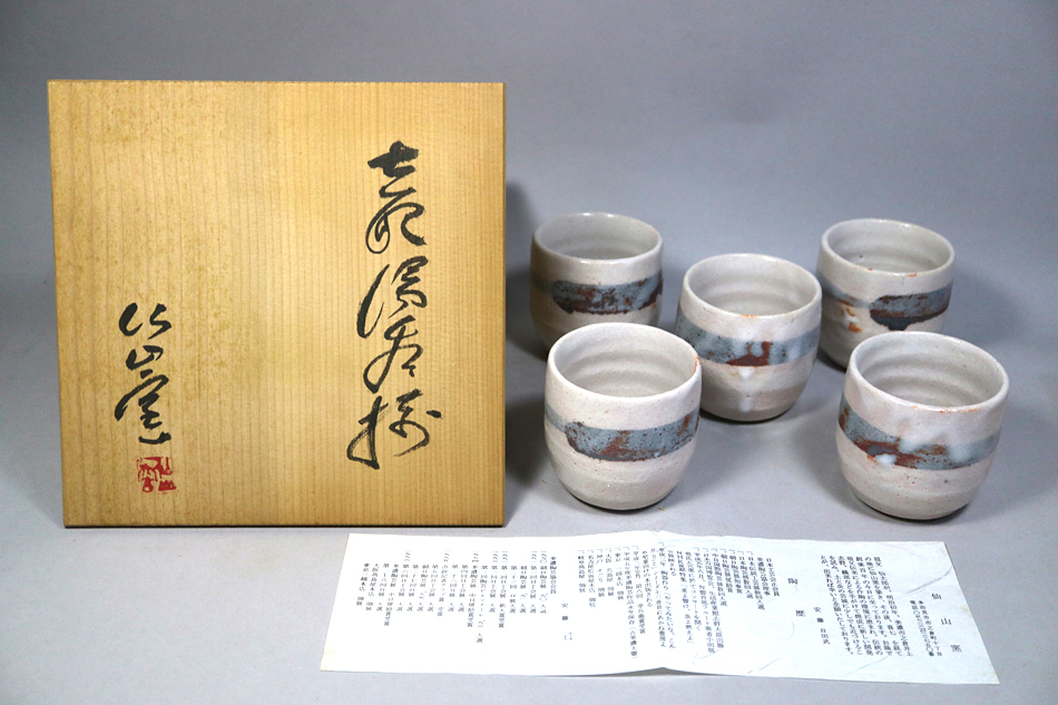 - ty28) 志野 湯呑揃 5客 安藤日出武 仙山窯 ●共箱 栞付き 県重要無形文化財 <茶道具 茶器 美濃焼 志野焼 ぐい呑み 茶碗