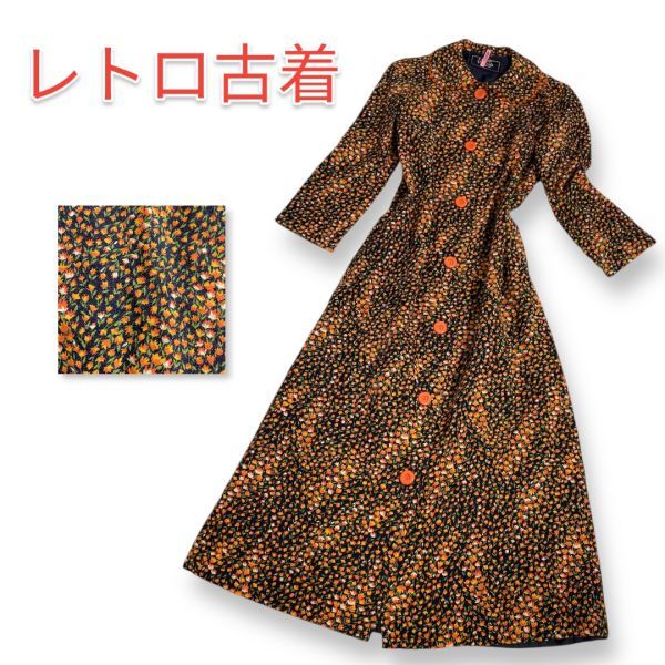 - 【レア】昭和レトロ ワコール ワンピース コート サイケ 総柄 花柄 黒 ヴィンテージ ゆったり エレガント 古着