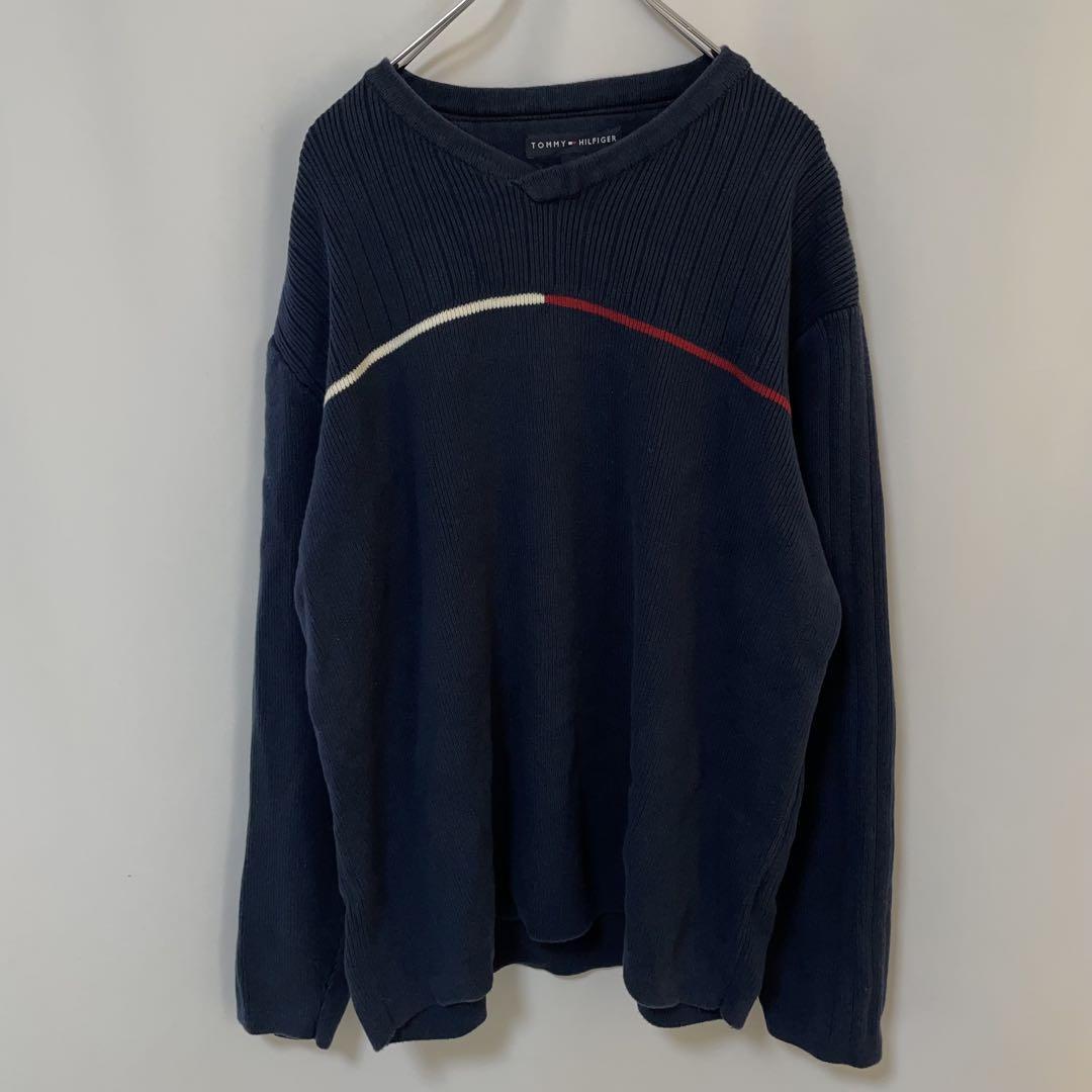 > N-2781 トミーヒルフィガー 古着 Vネック コットン ニット 厚手 紺 L