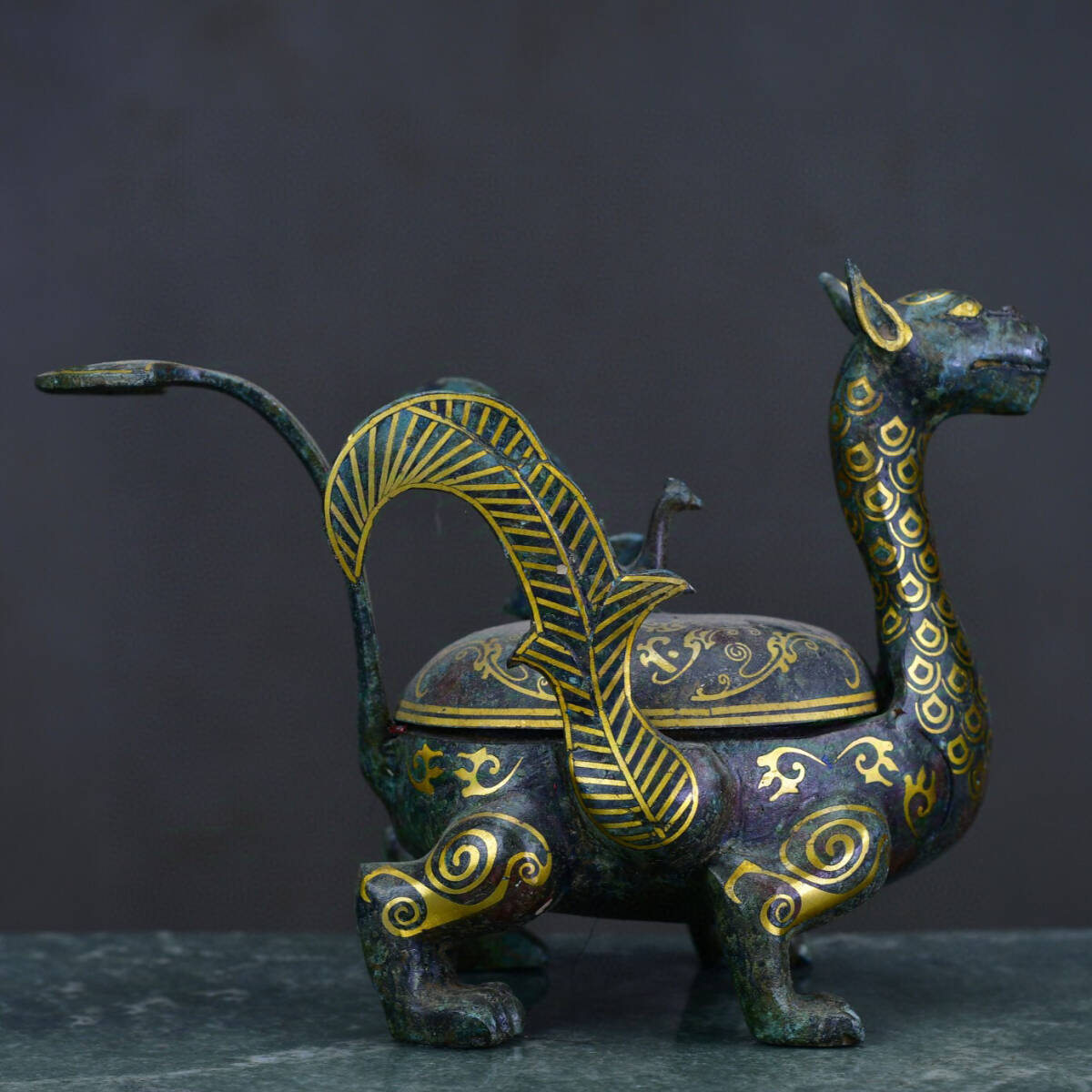- 【仁】『戦漢・青銅製・錯金瑞獣・置物・賞物』極細工 古賞物 中国古玩 古美術 古美味