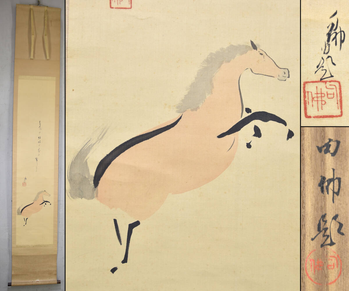 - 《真作》大谷句佛「牧馬 馬 画賛」 掛軸 日本画 書 古美術 東本願寺二十三世管長 絵を竹内栖鳳に学ぶ 絹本 淡彩 共箱 9227-0046