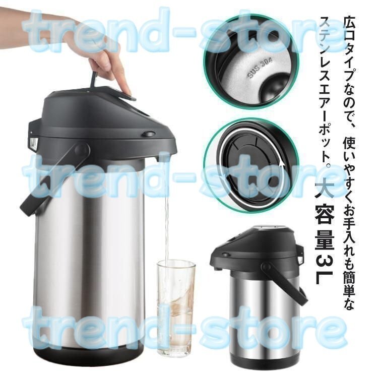 - 魔法瓶 卓上ポット 押す 保温ポット エアーポット 大容量 3L ステンレスエアーポット 保温保冷 熱湯 広口 エアー式給湯 360°底回転