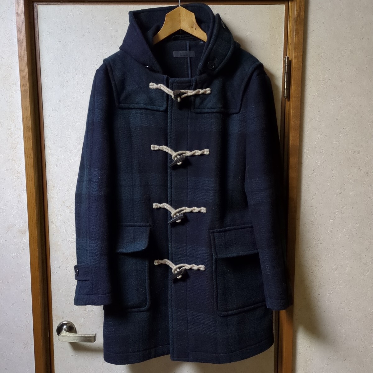 > ユニクロ ダッフルコート ブラックウォッチ 緑 紺 グリーン ネイビー チェック ダッフルコート ウール メルトン ロング コート M