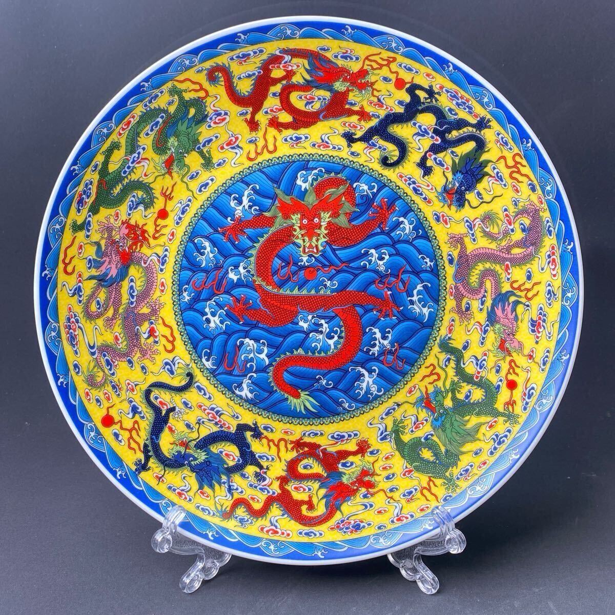- 中国古玩 古美術 粉彩 五彩龍紋 色絵 唐物 置物 時代物 藏出 飾り皿 飾皿 大清乾隆年製款 大皿 賞物 黄地八宝図 中国美術 観賞皿 中国陶磁