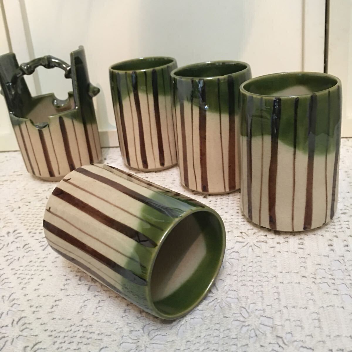 - 昭和レトロ 美濃焼? 織部? 瀬戸焼?詳細不明 湯呑み 手桶茶入 桶型容器 緑釉 縦縞模様 和モダン 茶器 茶道具 食器 ヴィンテージ 希少 廃盤