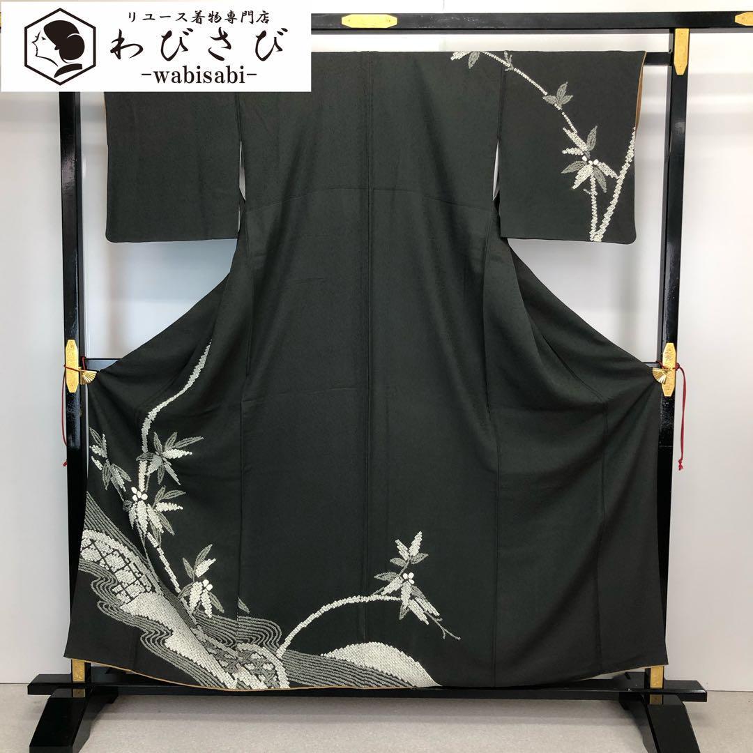 > 訪問着 流水に葉模様 絞り柄 消炭色 ますいわ屋 ふくよかサイズ K-4302