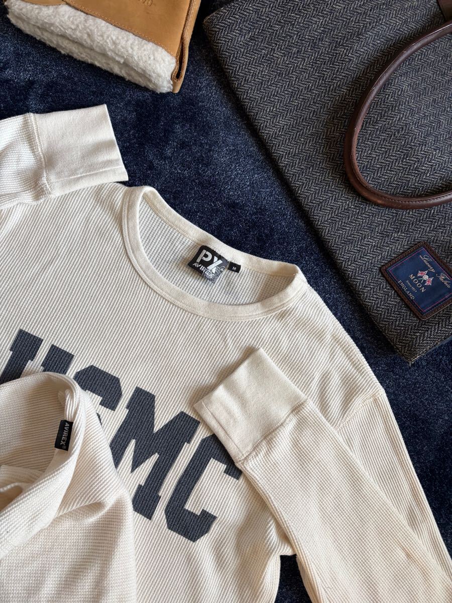 > 美品 正規販売 AVIREX アヴィレックス ワッフルサーマル素材 クルーネック 袖リブ仕様 ミリタリー 長袖シャツ sizeM NO.6163402 ホワイト