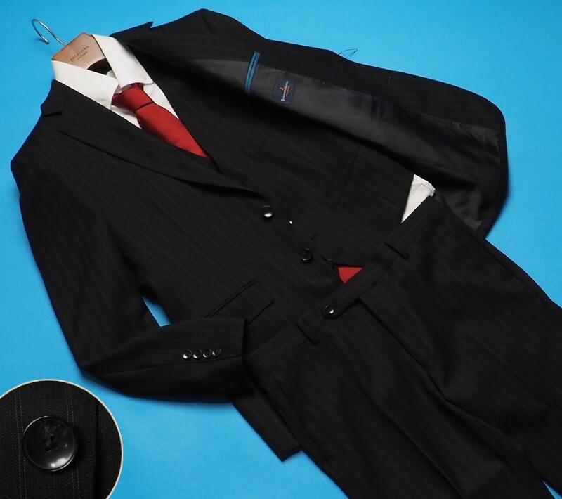 - 新品 大手百貨店扱い 秋冬 ウール100% 精細織柄ストライプ スリーピース スーツ BB5黒(A) 1157493