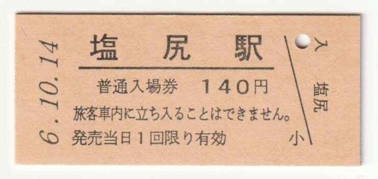 - 平成6年10月14日 中央本線 塩尻駅 140円硬券普通入場券(日付印刷)