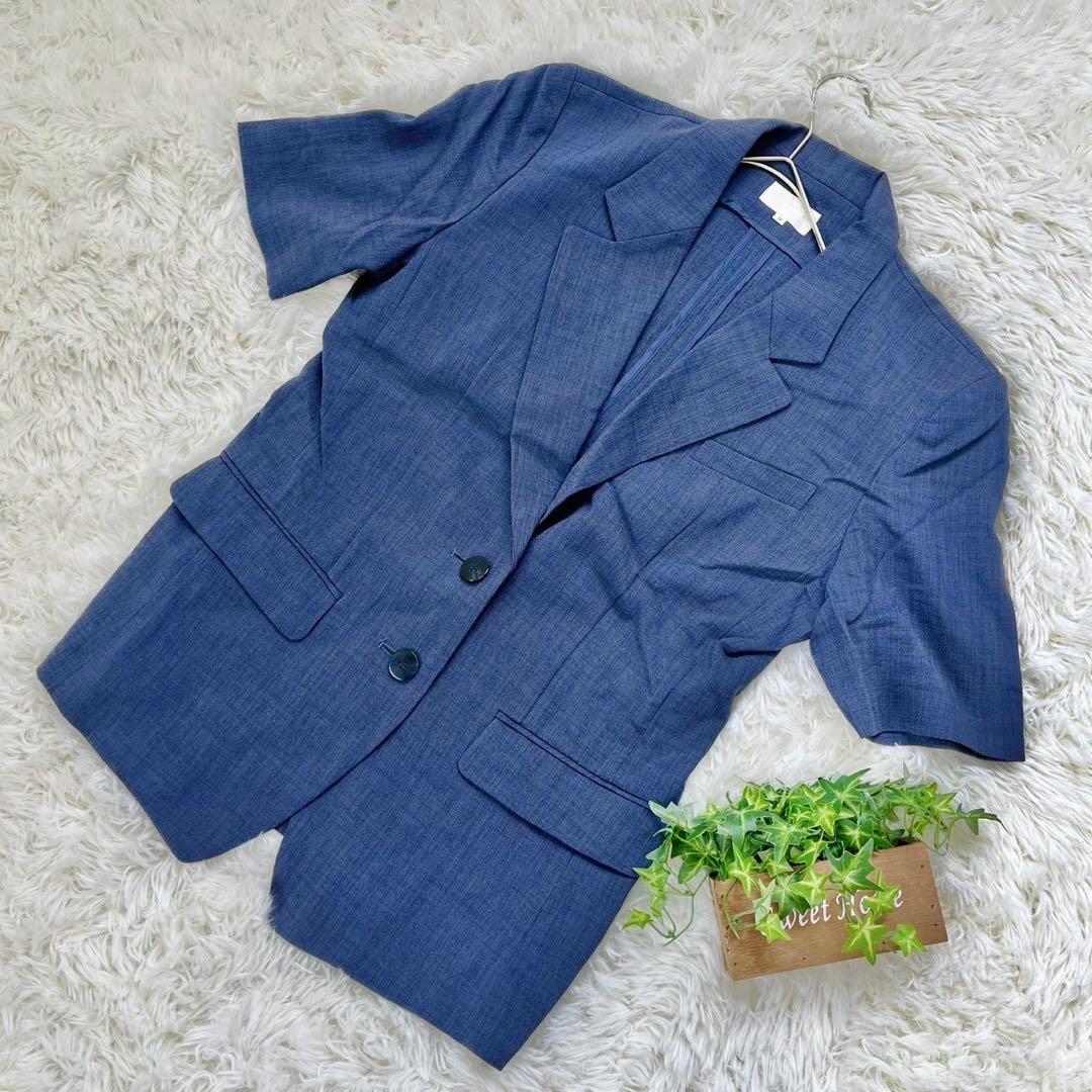 - 【Blancheur】混リネン 麻 半袖チュニック ジャケット ネイビー (M)