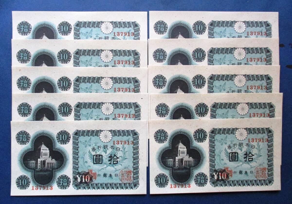 - 日本紙幣 日本銀行券A号 議事堂10円紙幣 137913 凸版印刷板橋工場印刷 ピン札10枚 SS2 画像参照してください。
