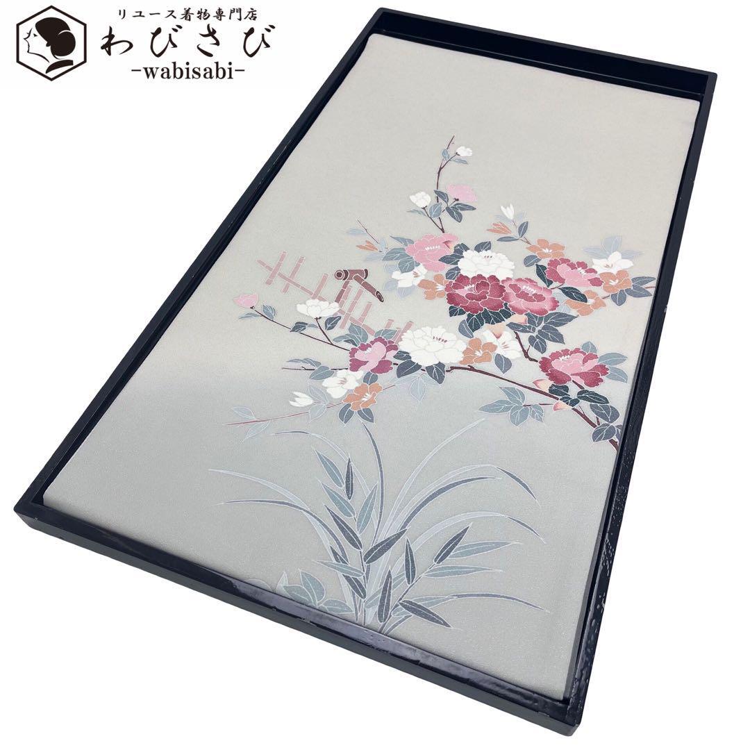 > 袋帯 作家物 友禅 牡丹の花模様 銀通し 灰白色 O-4568 着物 きもの kimono 和服 和装 中古 リサイクル着物 【送料無料】