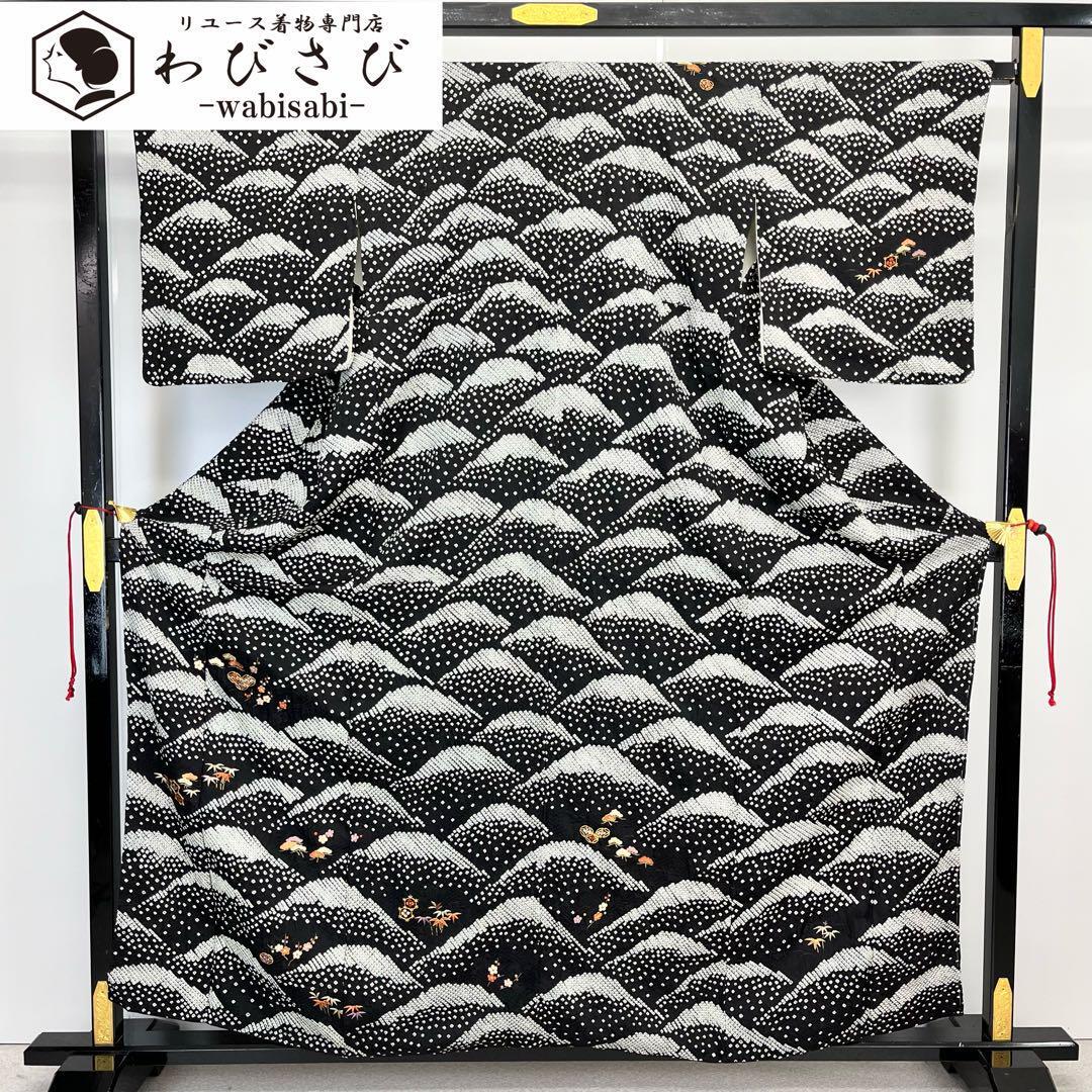 黒色のお色味に地模様、波模様の絞り柄、一部刺繍で松竹梅、花亀甲、花七宝などの柄裄がデザインされた素敵なお品でございます。