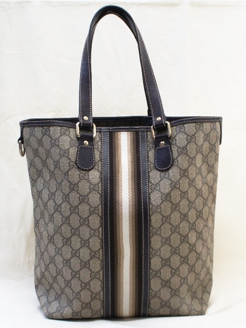 > GUCCI グッチ トートバッグ GGスプリーム PVC 茶 ベージュ 縦長タイプ ストライプ A4入ります 189896