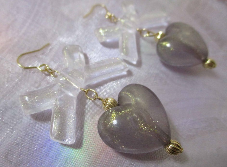 > * ハンドメイド ピアス リボン ハート メタルビーズ アクセサリー ゴールド パーツ 揺れる エレガント おしゃれ アート ミニチュア 雑貨