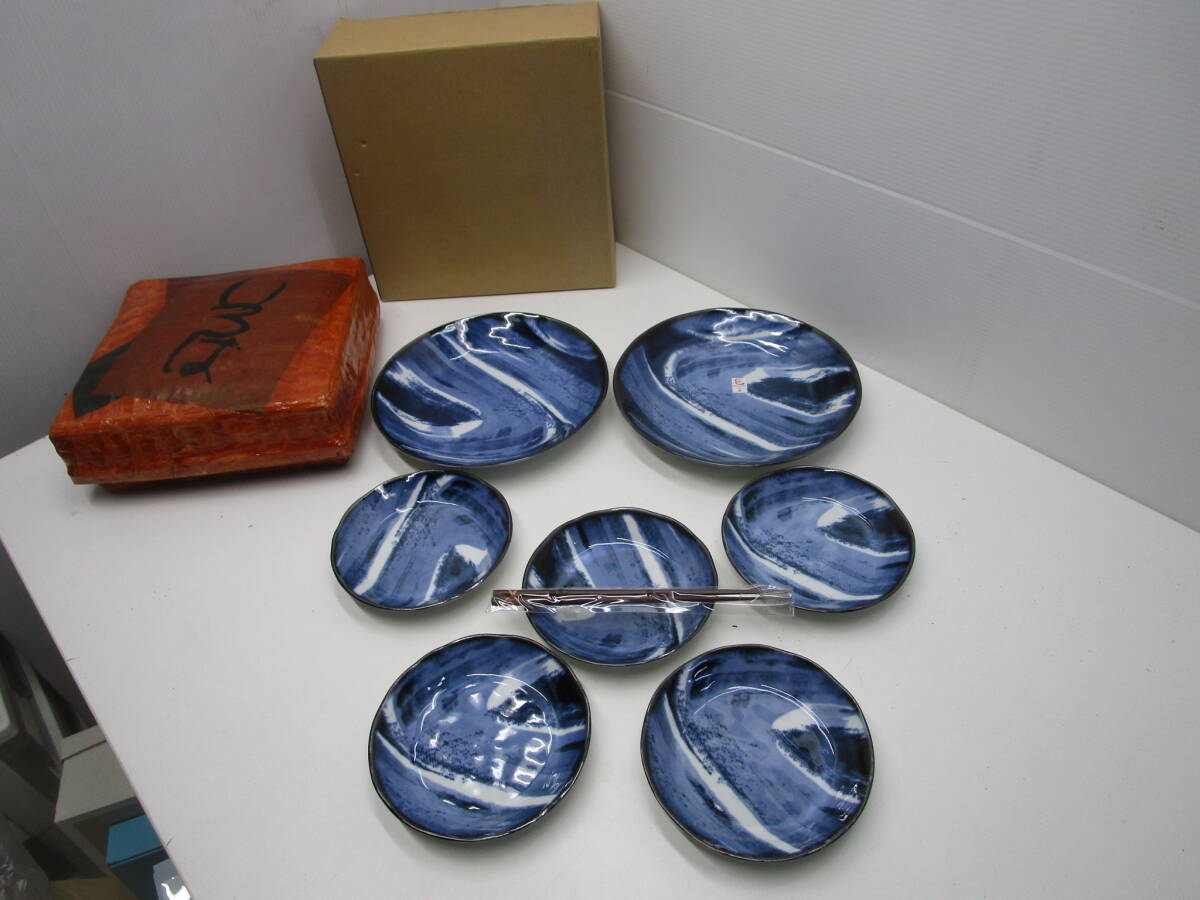- O662★匠工房 「いろは」呉須刷毛取分け揃 大皿2枚&取分け皿5枚★未使用品