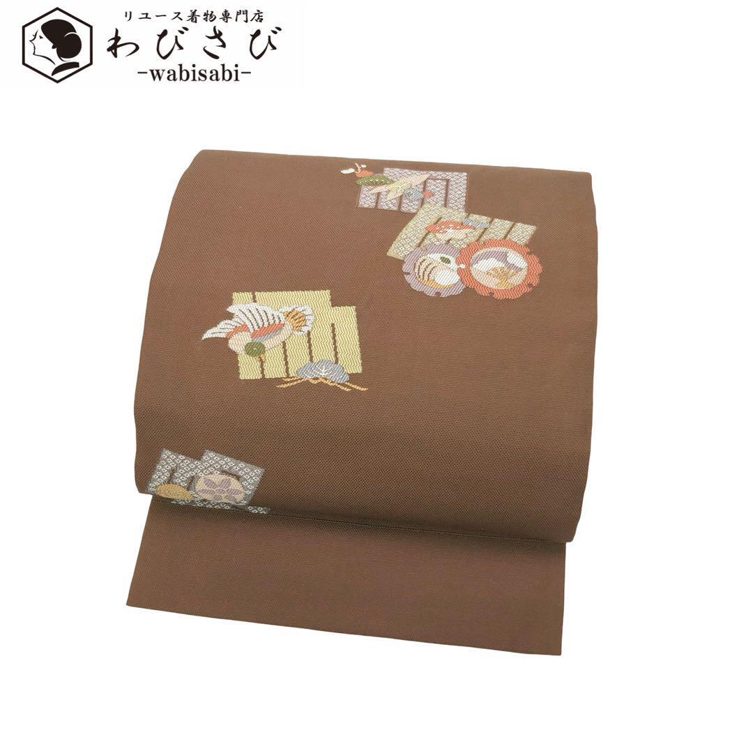 - 名古屋帯 源氏鳥に花柄 鳥 雪輪 茶色 長尺 O-4613 着物 きもの kimono 和服 和装 中古 リサイクル着物 【送料無料】