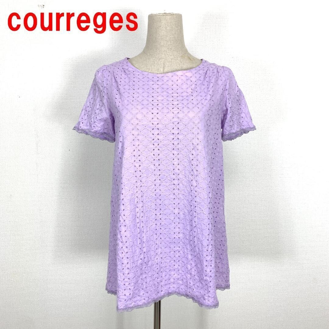 > A3874 クレージュ 半袖カットソー チュニック 綿 総レース courreges コットン パープル紫 38