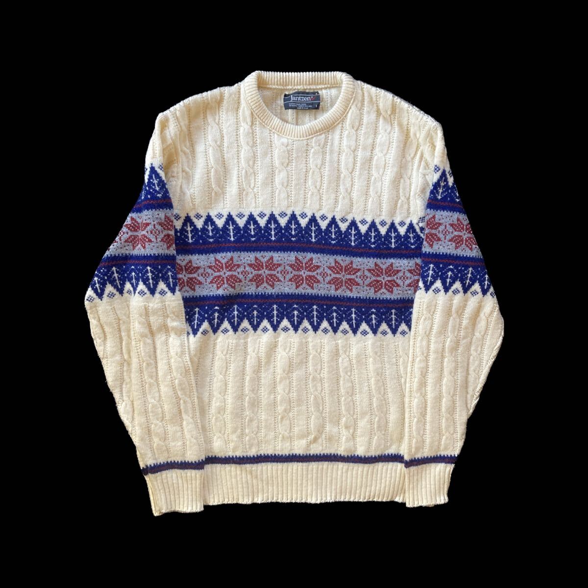 > 【雰囲気◎】80s Jantzen ノルディックセーター L アメリカ製 USA製 ジャンセン 雪柄 アクリルニット 白 ネイビー ヴィンテージ ビンテージ