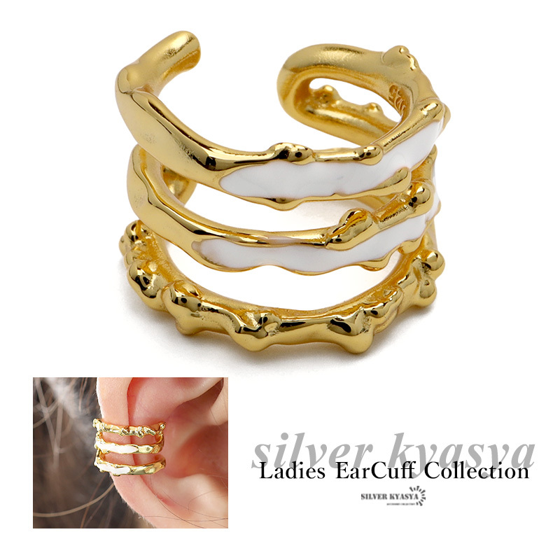 > イヤーカフ イヤリング 3連風 イヤカフ シルバー925 18KGP 18金 透かし でこぼこ 差し色 ゴールド ホワイト 片耳用