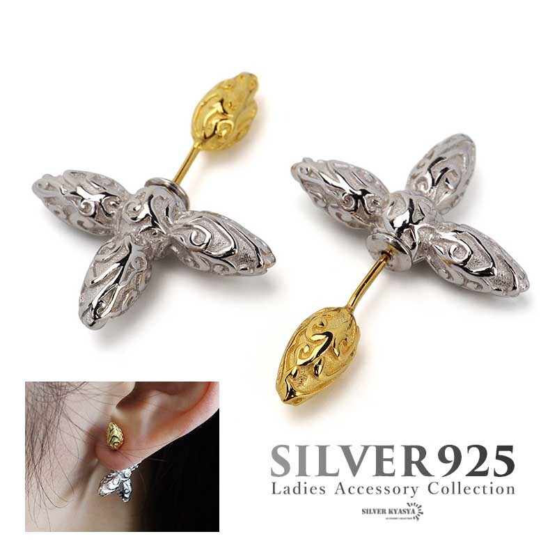 - 唐草ピアス クロスピアス シルバー925 スタッドピアス 両耳用 2点セット アラベスク クロス シルバー ゴールド 金属アレルギーフリー