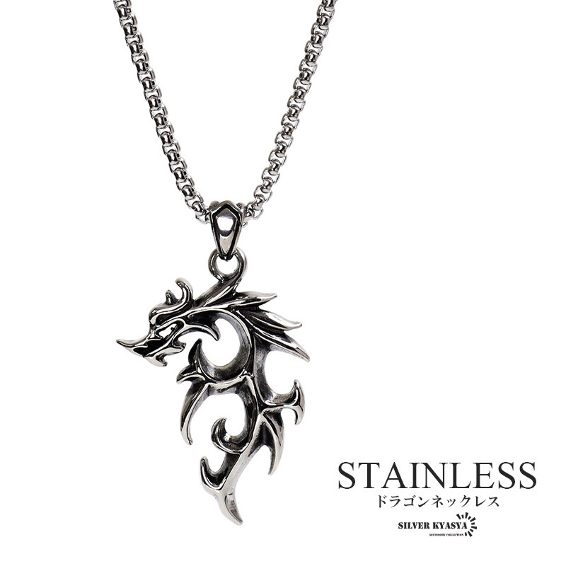 - ステンレス ドラゴンネックレス シルバー 龍 ペンダント竜 伝説 炎 メンズネックレス かっこいい ベネチアンチェーン付き