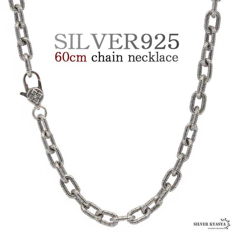 - 60cm ネックレス メンズ シルバー925 あずきチェーン チェーンネックレス 刻印 唐草模様 アラベスク 細身 金属アレルギー