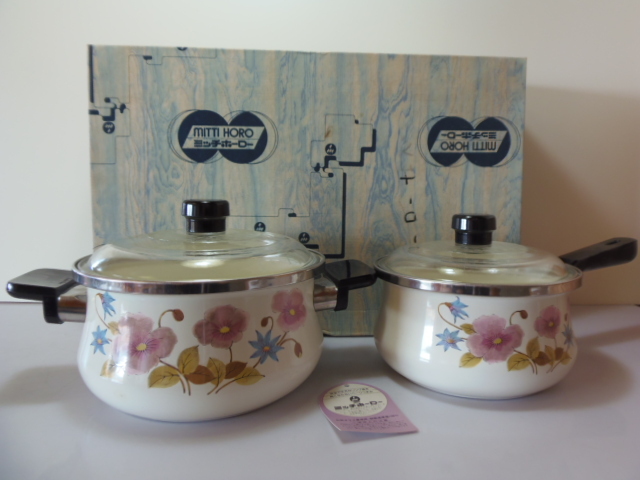 > T78 【琺瑯鍋 2点セット 両手鍋20センチ 片手鍋18センチ】 ミッチホーロー 花柄 ※難有(傷有・ガラス蓋傷有)【同梱不可】