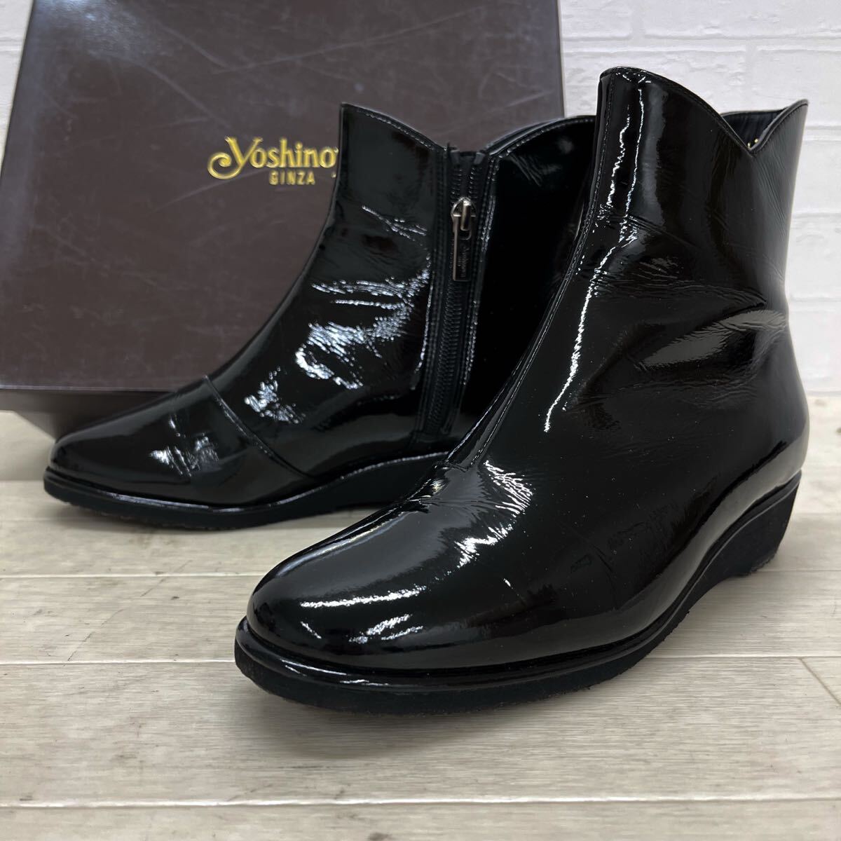 > K8★ 箱付 GINZA yoshinoya 銀座ヨシノヤ ショートブーツ エナメル ウェッジヒール サイドジップ 日本製 22 ブラック レディース