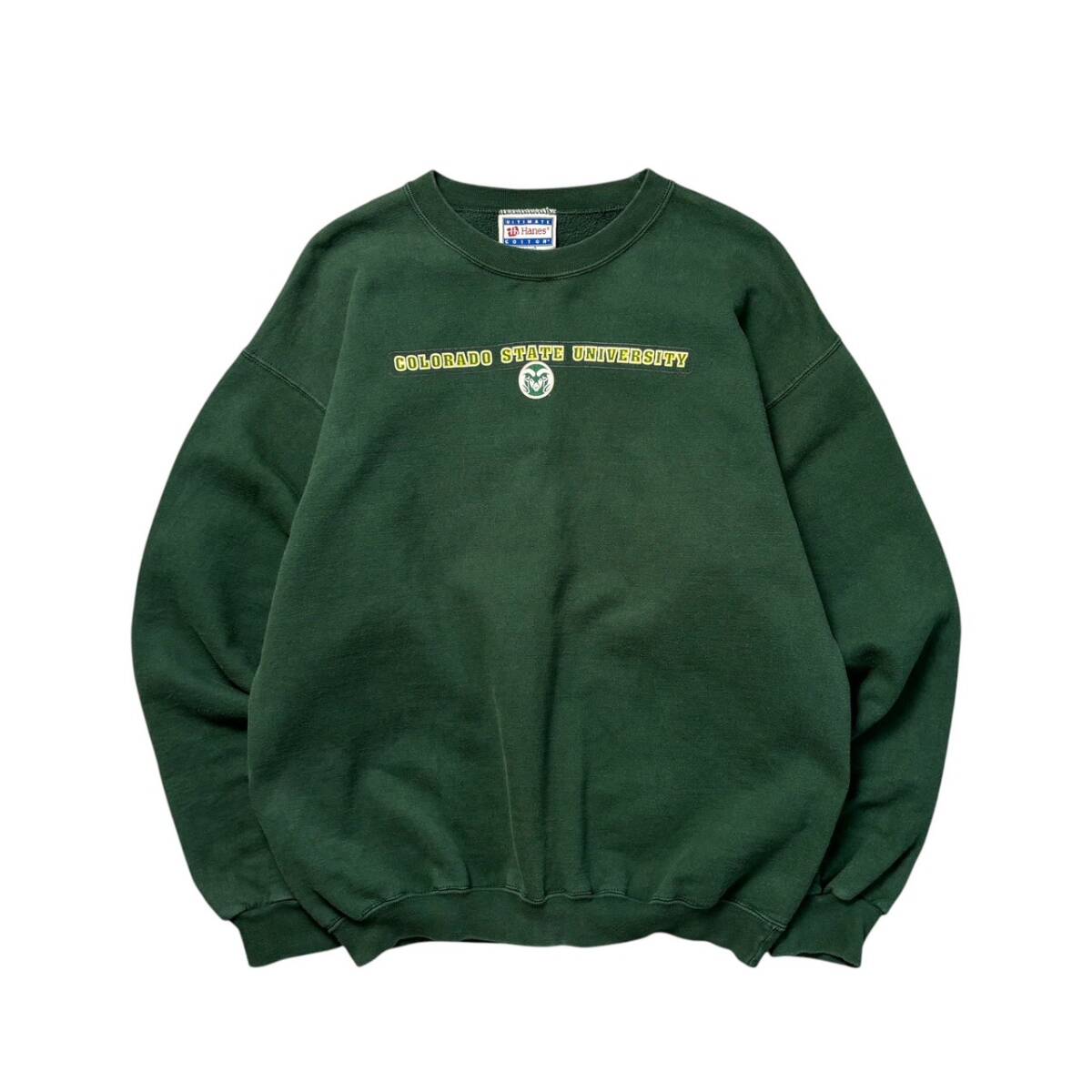 - Mサイズ 90s 00s Hanes ヘインズ 古着 スウェット トレーナー カレッジロゴ プリント 2段 シンプル 裏起毛 緑 グリーン