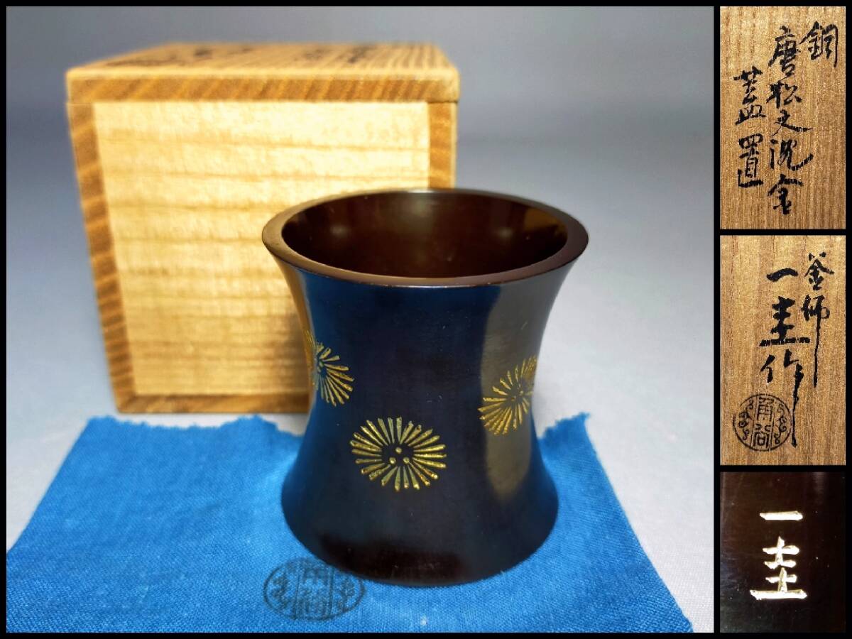 - FT29 銅製 蓋置 人間国宝 釜師 角谷一圭 作 銅 唐松文沈金 共布袋・共箱 茶道具