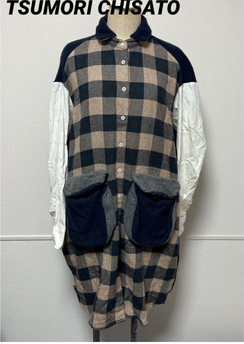 - 【日本製 襟脱着】TSUMORI CHISATO ブロックチェック ニット ドッキング シャツ ワンピース ジャケット ツモリチサト サイズ2 M フランネル